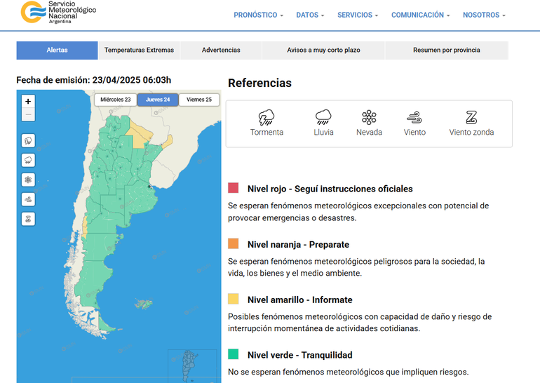 -Misiones (Eldorado - Iguazú - Zona baja de General Manuel Belgrano - Zona baja de Montecarlo). El área será afectada por lluvias y tormentas, algunas localmente fuertes. Las mismas podrán estar acompañadas por fuerte actividad eléctrica, granizo, ráfagas de hasta 60 km/h, y principalmente abundante caída de agua en cortos periodos. Se prevén valores de precipitación acumulada entre 40 y 70 mm, pudiendo ser superados en forma puntual.