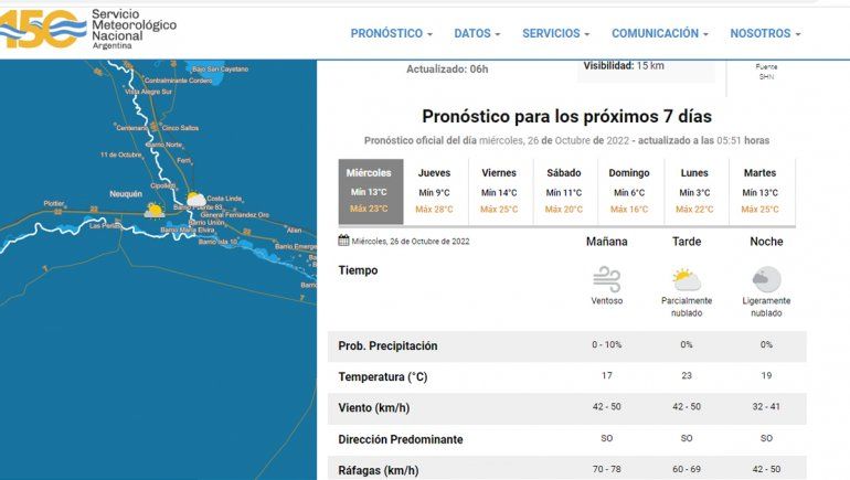 El tiempo para el jueves mejorará especialmente durante la mañana en el Alto Valle. Se esperan temperaturas prácticamente de verano, pero con el viento siempre presente. El SMN pronosticó una madrugada con cielo ligeramente nublado y una temperatura de 9 grados, mientras que por la mañana ascenderá a los 13 grados con cielo parcialmente nublado. A partir de la tarde estará muy ventoso con una temperatura de 28 grados y hacia la noche descenderá a los 20 grados. El viento se irá incrementando con el transcurrir de la jornada con ráfagas entre 70 y 78 kilómetros por hora.