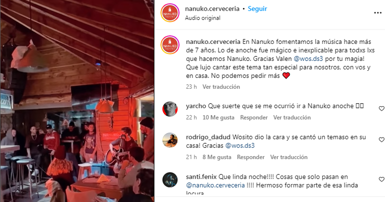 “En Nanuko fomentamos la música hace más de 7 años. Lo de anoche fue mágico e inexplicable para todxs lxs que hacemos Nanuko. Gracias Valen @wos.ds3 por tu magia! Que lujo cantar este tema tan especial para nosotros, con vos y en casa. No podemos pedir más ”, postearon.