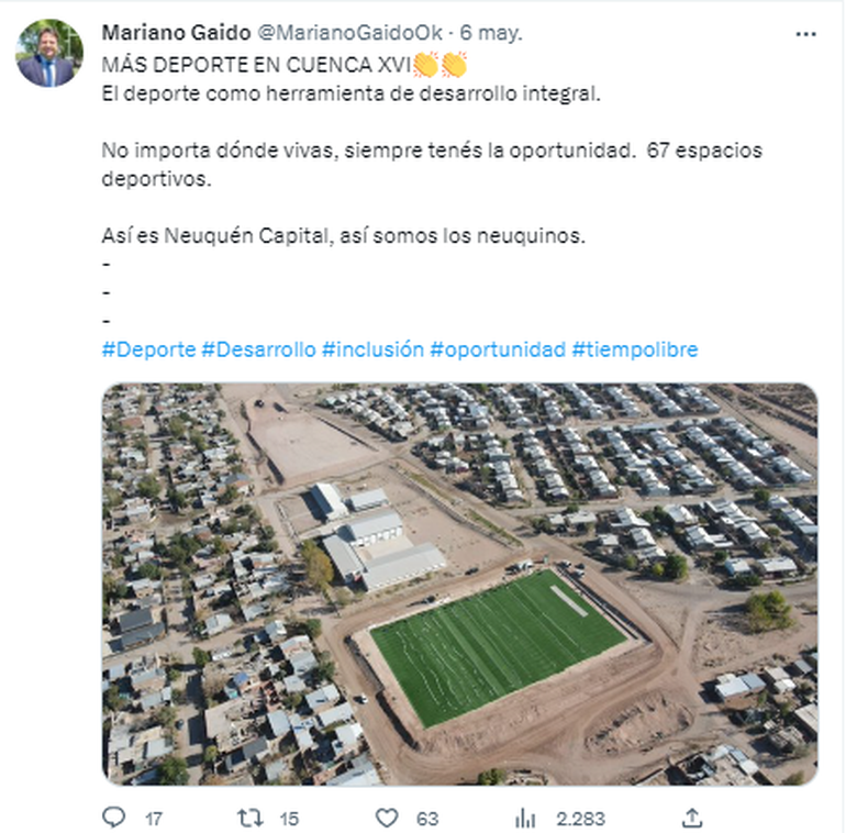 Asimismo, remarcó la mirada social que tiene el trabajo en equipo con el gobierno provincial porque “además de esta cancha, se construyó una cancha en el Parque del Oeste y otra que se inaugurará en Cuenca XVI” para que “todos los vecinos y vecinas de la ciudad de Neuquén tengan las mismas oportunidades de accesibilidad al deporte, desarrollando una vida sana y con oportunidad de crecer”.