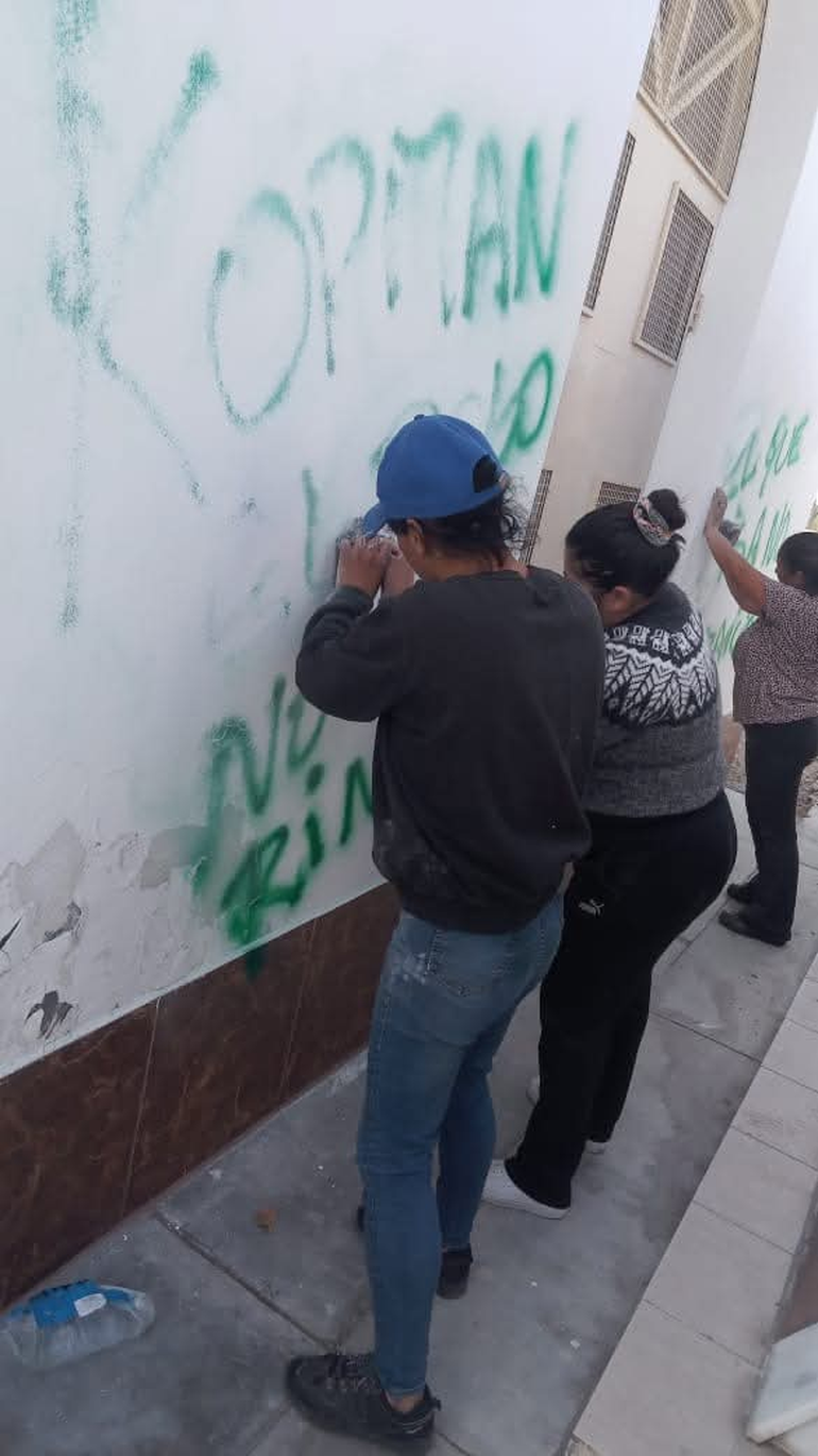 Por otra parte la cooperativa sindicada como autora de las pintadas vandálicas en horas del mediodía de este sábado difundió un parte de prensa en su perfil de Facebook, acompañadas de fotos y videos donde muestran las tareas de remediación encaradas sobre el panteón que sufrió los actos de vandalismo. “Nosotros no fuimos, la cooperativa se está haciendo responsable. Vamos a pintar porque repudiamos todo hecho de vandalismo. Nuestro reclamo es genuino”, aseguró una referente del grupo de trabajo mientras repintaban el panteón.