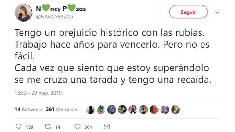 "La discriminación por rubia también es bastante básica", lanzó y enseguida el Pollo Álvarez, quien está al frente el envío matutino de El Trece, le aclaró que fue Nancy Pazos quien la tildó de "rubia tarda" en Twitter.