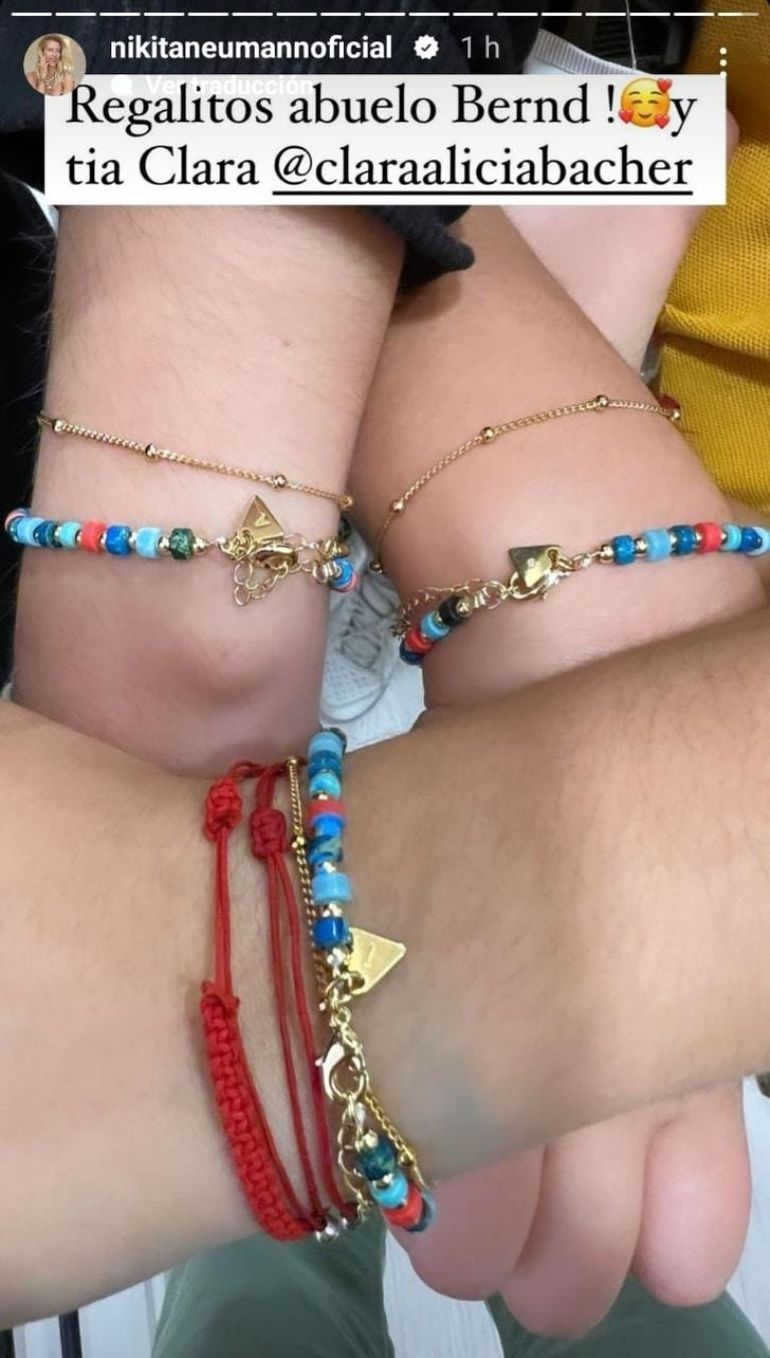 "Regalitos de abuelo Bernd y tía Clara", fue la leyenda que utilizó la mediática en una historia de Instagram en la que se pueden ver diferentes pulseras de oro y mostacillas de colores celeste, azul y rojo.