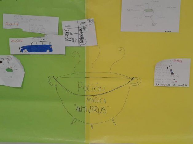 De la mano de las promotoras de participación infantil, los pequeños conversaron sobre el coronavirus y quisieron aportar una solución desde las infancias para ayudar a superar la pandemia. Se les ocurrió pensar en ingredientes para una poción que le ponga un freno al Covid y volcaron sus ideas en una producción grupal.