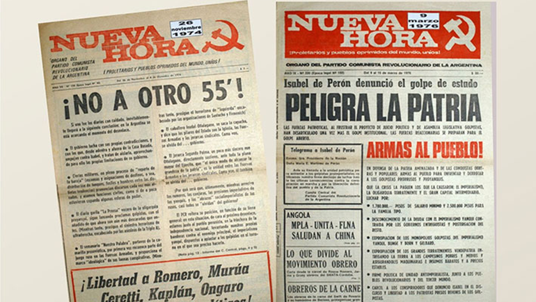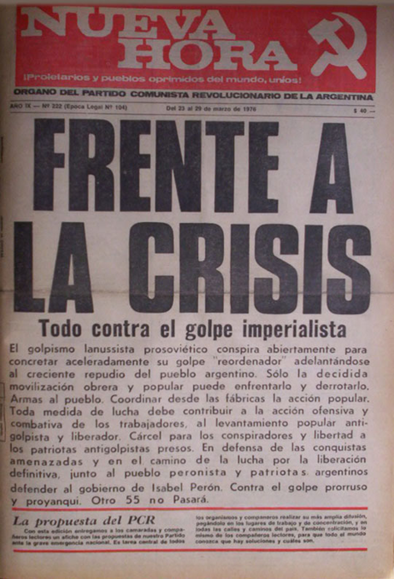 En el órgano oficial del PCR la revista Nueva Hora, del día 9 de marzo de 1976 puede leerse un titular grande “Armas para el pueblo”. “No a otro 55”. En la revista que salió el 23 de marzo, un día antes del golpe dicen: “Frente a la crisis. Todos contra el golpe imperialista”