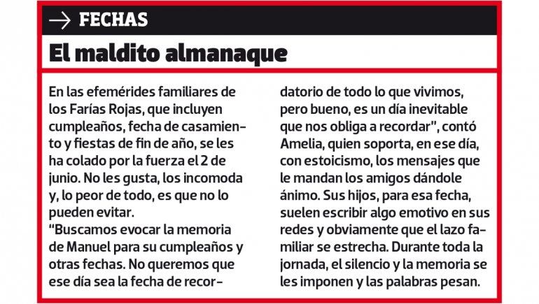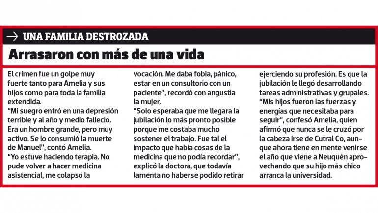 Sobre las intrigas que existen en torno al móvil del crimen, Amelia sostiene que “se dijeron muchas cosas que lo único que hicieron fue ensuciar el buen nombre de Manuel. Se dio a entender que como no le habían robado nada había sido un ajuste de cuentas. A mí me quedó en claro, en el juicio abreviado que se le hizo a Molina, que fue un robo que les salió mal. Molina dijo que habían ido a sacar cosas y su intención no fue matarlo. Yo tomé la palabra y le dije a la jueza que para mí quien va con un arma tiene intención de matar”.