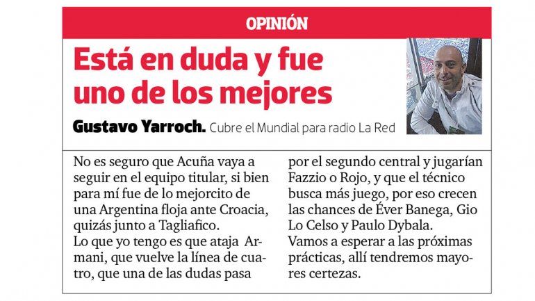 Si lo saca a Marcos Acuña del equipo que enfrentará el martes a Nigeria, Jorge Sampaoli estará haciendo la más fácil nuevamente. O quizás lo que le piden los referentes, que, según cuentan algunos, tienen hoy incluso más poder que el propio entrenador. Es decir, sacar a uno de los nuevos, de bajo perfil y cero polémica, sin reparar en que fue de lo mejorcito en la paliza frente a Croacia.