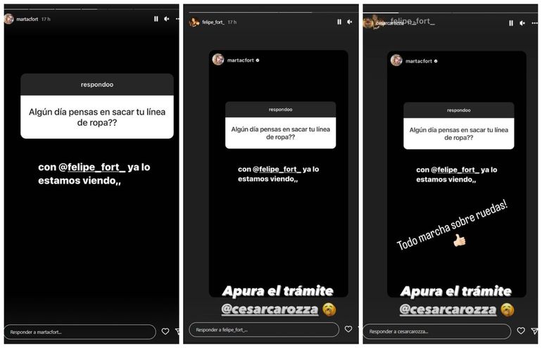 “¿Algún día pensás en sacar tu línea de ropa?”, le preguntó un seguidor a Marta en Instagram. “Con Felipe ya lo estamos viendo”, respondió la hija de Fort. Felipe, por su parte, contó cuál es su sueño: “Me encantaría, me falta un entrenador, un nutricionista y ganas, porque solo cuelgo una banda”.