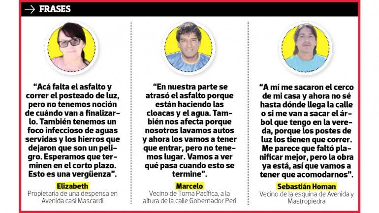 Los vecinos están molestos porque el Municipio habilitó el tránsito sin las medidas de seguridad mínimas y temen que algún chiquito sufra las consecuencias. “Esto es un peligro, con los hierros en punta, el pozo de las cloacas que hicieron al lado de mi casa y los autos que pasan muy rápido por cualquier lado”, se quejó Jennifer Toledo, vecina de Avenida del Trabajador y Manuel Rodríguez. Por las dudas, ella mantiene a su hijito dentro del patio y no lo deja salir a la vereda.