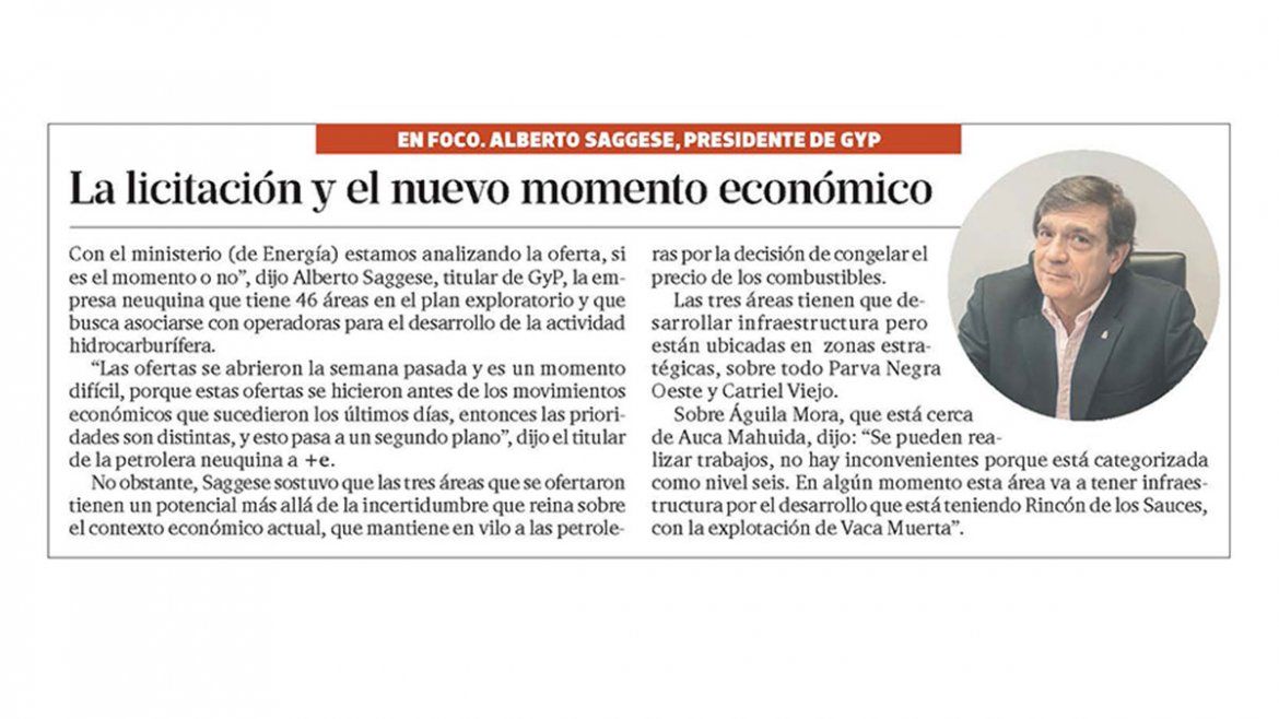 Alberto Saggese, presidente de GyP, explicó que la decisión “se está charlando con el Ministerio de Energía”, pero que en el actual contexto económico y para el sector hidrocarburífero, podría llevar un análisis más complejo en el tiempo.