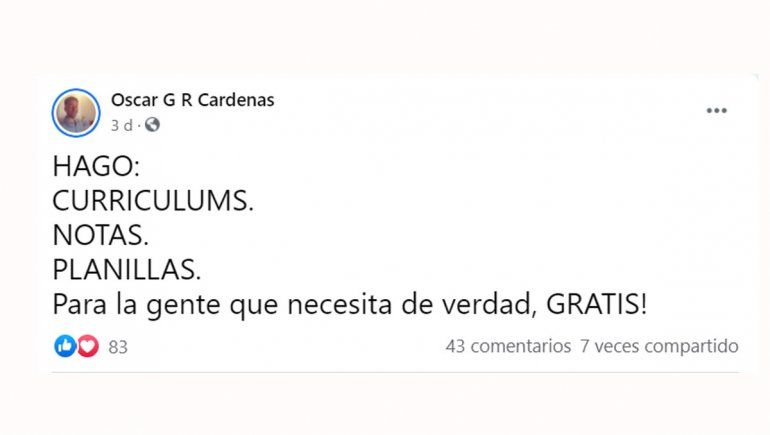 “Se me dio por publicar en un grupo de Facebook porque sé lo que es necesitar trabajar y no tener ni idea por donde empezar”, explicó el hombre a LMN. Su intención también es la de devolver a la comunidad lo que alguna vez le brindaron a él, cuando allá por el año 2018 la provincia dictó un curso de armado de curriculums vitae.