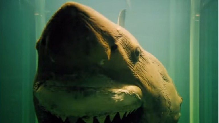 El youtuber saltaba entre los escombros hasta que una sombra lo hizo sobresaltar. Se dio vuelta y vio que dentro de la pileta había ¡un enorme tiburón! ¿Vivo? Claro que no, se trataba de un gran tiburón blanco de 5 metros, que murió en 1998 por las redes de pesca de atún en el sur de Australia. ¿Cómo se mantiene así? Es una pieza de taxidermia, que se conserva en ese tanque gigante lleno de formol.