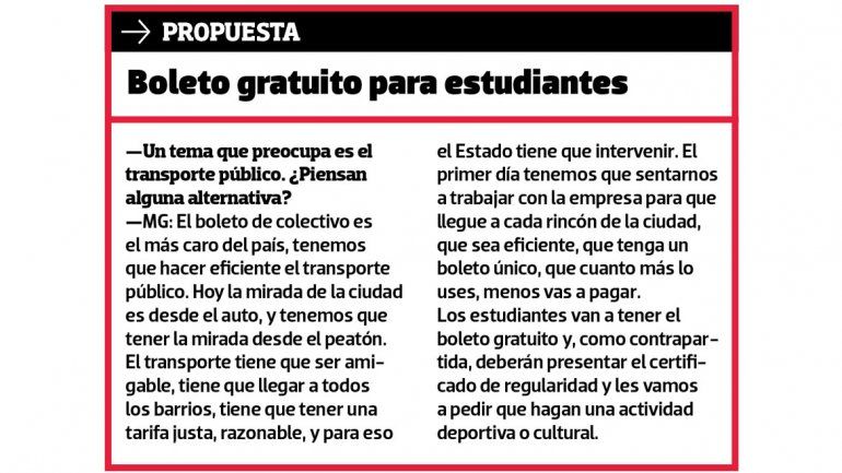 MG: El boleto es el más caro del país, tenemos que hacer eficiente el transporte público. Hoy la mirada de la ciudad es desde el auto y tenemos que tener la mirada desde el peatón. El transporte tiene que ser amigable, tiene que llegar a todos los barrios, tiene que tener una tarifa justa, razonable y para eso el Estado tiene que intervenir. El primer día tenemos que sentarnos a trabajar con la empresa para que llegue a cada rincón de la ciudad, que sea eficiente, que tenga un boleto único, que cuanto más lo uses, menos lo vas a pagar.