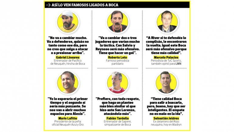 Esa consulta le trasladamos a personajes y DT ligados al xeneize. Uno de ellos es el famoso periodista partidario Roberto Leto, quien anticipó: “El equipo va a cambiar 2 ó 3 jugadores respecto a aquel partido pero cambiará mucho tácticamente.Ya con Salvio de un costado y Reynoso del otro cambia todo. Será más ofensivo y tiene que tener Boca la intención de ir a buscar un gol en el Monumental que va a ser clave”, consideró. El DT de Pacífico de Neuquén, Gabriel Lineares, simpatizante boquense, opinó distinto: “Alfaro no va a cambiar mucho el planteo ya que le ha dado resultado. No creo que le juegue de la misma manera, porque Gallardo ya tomó nota. Tampoco creo que salga a atacarlo ni a meterle mucha gente en ofensiva. Va a defenderse, a contratacar, pero no del mismo modo”.