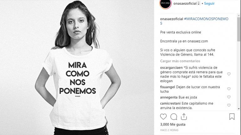 "#MIRACOMONOSPONEMOS. Pre venta exclusiva online. Encontrala ya en onasaez.com", reza un mensaje en la cuenta oficial de la compañía en Instagram junto a una postal donde aparece una modelo luciendo una remera color blanco con la frase escrita con letras negras. "Si vos o alguien que conocés sufre Violencia de Género, llama al 144", agregan en el posteo.