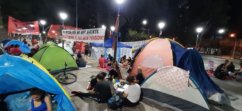 Organizaciones sociales se instalaron este martes por la tarde y harán un acampe durante toda la noche en la explanada del monumento al General San Martín para visibilizar un reclamo por el aumento del salario mínimo, vital y móvil (SMVM).