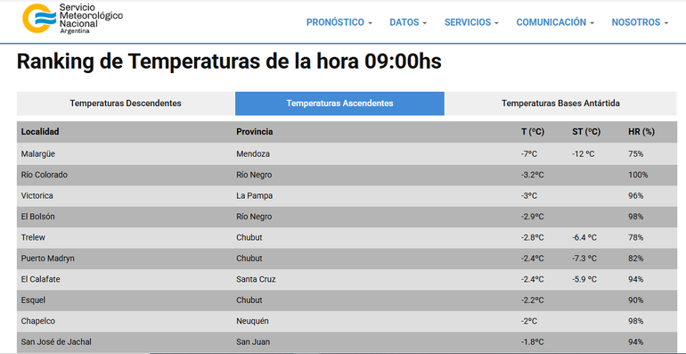 El frío intenso llegó a todo el país y la sensación térmica en una localidad alcanzó los 12°C bajo cero y una temperatura de 7°C bajo cero. Se trata de la ciudad de Malargüe, en Mendoza, que lidera el ranking de las temperaturas más bajas a las 9 de la mañana, así lo publicó el SMN.