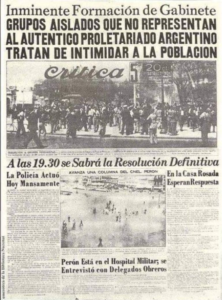 Para esas fechas (en que los aliados sellan su triunfo en la guerra) la presión contra el Coronel Perón que todavía no había explicitado su voluntad se crear un movimiento político, alcanza su punto máximo. En octubre los universitarios de la FUBA arrancan el mes con un paro (contra el nazi-fascismo). Y el día 9 el general Avalos y el Almirante Verlengo Lima encabezan un planteo militar contra Perón, exigen su destitución y posterior apresamiento.