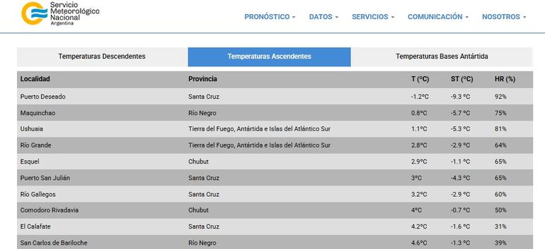 Las bajas temperaturas ya se hacen sentir en el centro y sur de la Patagonia, con presencia de chaparrones de nieve dispersos. El SMN indicó en su ránking que son varias las localidades que ya registran un marcado frío. En Puerto Deseado, Santa Cruz, la sensación térmica alcanzó los 9.3°C bajo cero, seguido por Maquinchao, en Río Negro con 5.7 ºC bajo cero y Ushuaia, en Tierra del Fuego con 5.3 ºC bajo cero.