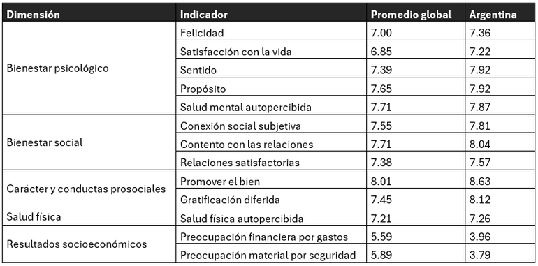 En la dimensión de bienestar psicológico se evaluaron felicidad, satisfacción con la vida, sentido, propósito y salud mental autopercibida; en bienestar social, la conexión social subjetiva y la satisfacción con las relaciones; en carácter y conductas prosociales, la promoción del bien y la gratificación diferida; en salud física y comportamientos de salud, la salud física autopercibida; y en resultados socioeconómicos, la preocupación financiera por los gastos cotidianos y la preocupación material por seguridad, alimentación o vivienda.