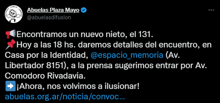 La organización Abuelas de Plaza de Mayo anunció este jueves la "restitución de identidad" del nieto 131 y convocó a una conferencia de prensa a las 18 para dar a conocer detalles de la historia.