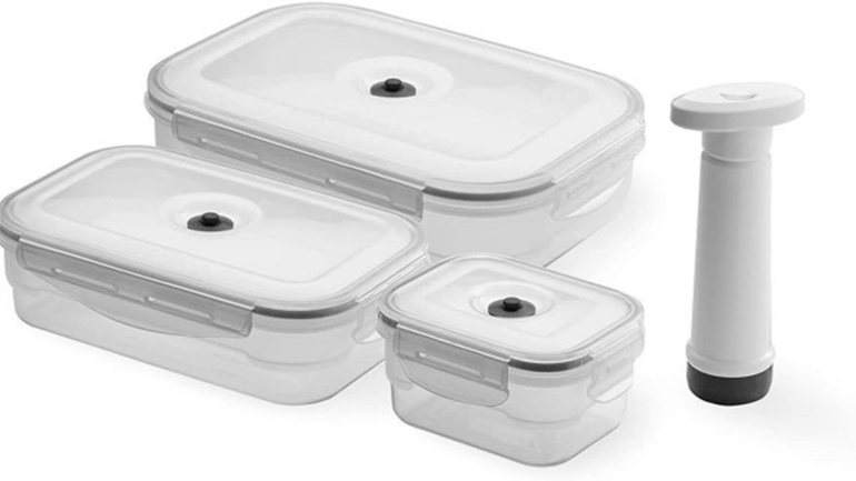 Diseñados para extraer el aire de su interior, estos tuppers evitan la proliferación de bacterias y hongos logrando que los alimentos perduren en el tiempo. Claro que para que ello ocurra, estos recipientes cuentan con una válvula hermética y se utilizan con una bomba de vacío que elimina el oxígeno dentro del tupper.