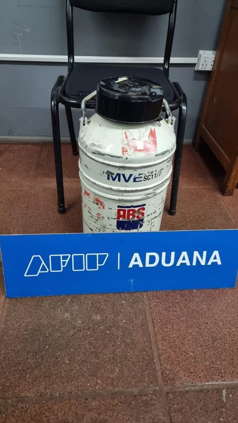 Entre los cientos de decomisos que diariamente hace Aduana Argentina, hubo uno que llamó la atención por el tipo de producto. Mientras hacían una revisión de rutina, agentes del organismo detuvieron a un vehículo brasileño conducido con destino Puerto Iguazú, que en la parte trasera del rodado tenía un bulto, disimulado con una prenda de vestir. Una vez retirado del interior, resultó ser un recipiente con nitrógeno, los que son utilizados para el transporte de semen de toro o material vivo.