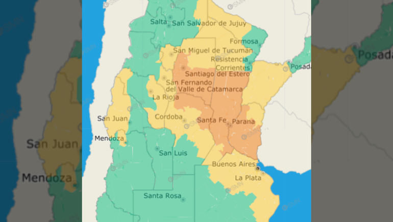 Además, el norte de Entre Ríos, suroeste de Corrientes, sur de Santa Fe, gran parte de Córdoba, este de La Rioja, Catamarca, Tucumán, norte de Santiago de Estero y Chaco están afectadas por una alerta amarilla por tormentas.
