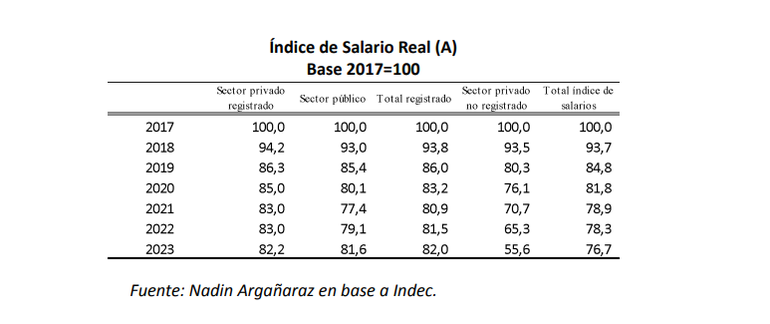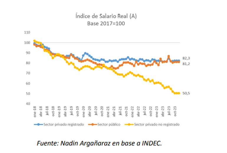 Si se toma como base de comparación el poder adquisitivo de los salarios del 2017, es decir, el inicio del gobierno de Mauricio Macri, los trabajadores privados formales perdieron en 2023 el 17,8%; los trabajadores públicos. 18,4% y los informales, 44,4%.