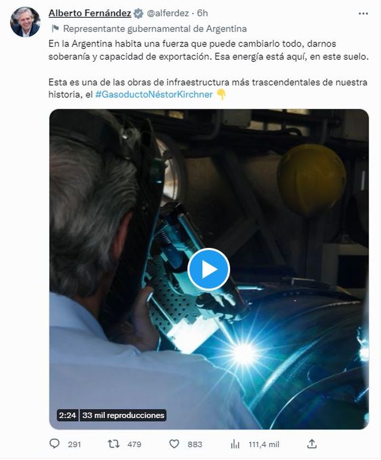 En el video, el Presidente sostuvo que: "Estamos hablando del Gasoducto Néstor Kirchner, pero sobre todo estamos hablando de transformar, de una vez y para siempre, la historia argentina, dentro de apenas diez años. Estamos hablando de exportar 40 mil millones de dólares en energía".