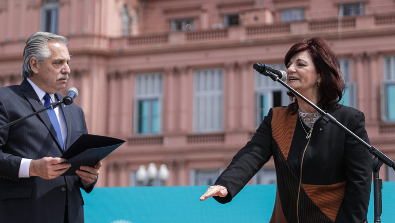 El presidente Alberto Fernández tomó juramento a las nuevas ministras de Trabajo, Desarrollo Social y Mujeres, Género y Diversidades y llamó a mantener la “unidad” para "ganar" las elecciones de 2023, en un mensaje frente a centenares de funcionarios y dirigentes del Frente de Todos presentes en el acto.