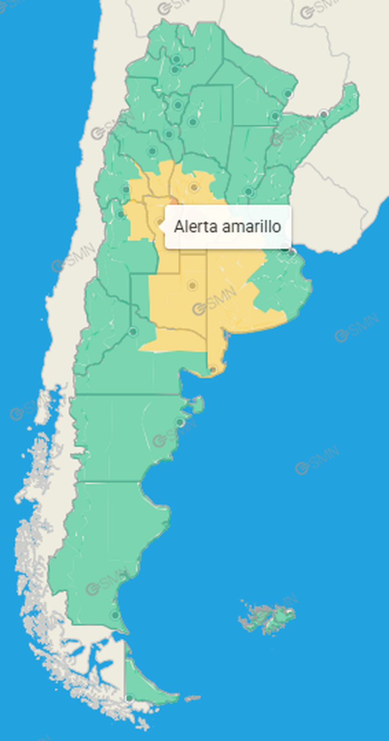El SMN informó que las áreas bajo alerta podrían ser afectadas por tormentas de variada intensidad, algunas localmente fuertes. Se prevé que estén acompañadas por abundante caída de agua en cortos períodos, actividad eléctrica frecuente, ráfagas intensas y ocasional caída de granizo.