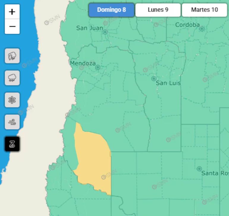 Las provincias bajo alerta son: algunas zonas de Buenos Aires, Chubut, Río Negro, La Pampa, San Luis y Mendoza.