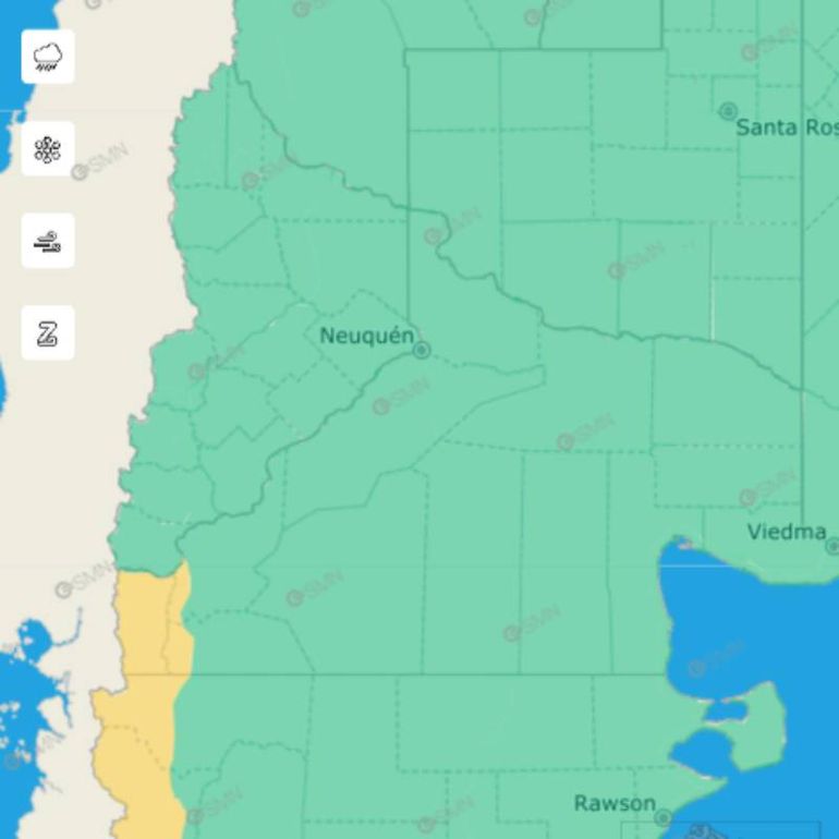 En este caso la alerta es más amplia, porque cubre la totalidad de Neuquén y gran parte de Río Negro, alcanzando el Alto Valle.