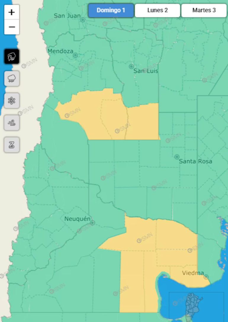 El Servicio Meteorológico Nacional (SMN) emitió uan alerta por lluvias y tormentas en algunas zonas de Mendoza, San Luis, Río Negro, Neuquén, Chubut y Santa Cruz.
