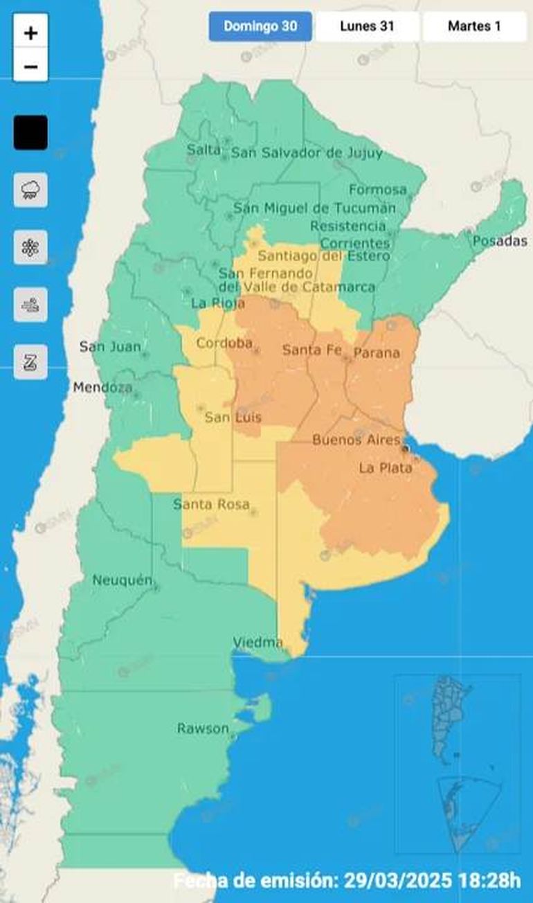 El SMN emitió una alerta amarilla en la Ciudad y la provincia de Buenos Aires, y Entre Ríos, Santiago del Estero, Córdoba, Santa Fe, La Rioja, San Luis, Mendoza y La Pampa.