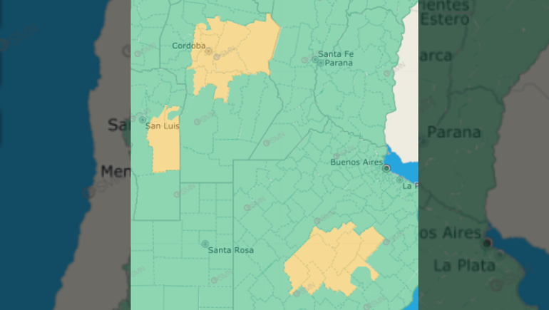 Puntualmente, estarán afectados el centro de la provincia de Buenos Aires, en la zona de Olavarría, Azul y Tandil; el noreste de Códoba, afectando la capital y localidades como San Francisco, Jesus María y Oliva; y el centro este de San Luis, sintiéndose más en Villa Mercedes y alrededores.
