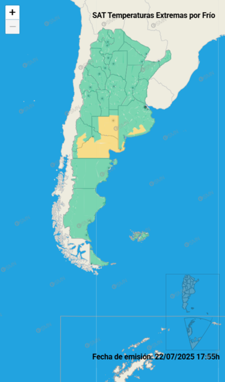 Bajo este panorama, el Servicio Meteorológico Nacional (SMN) emitió una alerta amarilla por frío extremo que alcanzará este miércoles a las provincias de La Pampa, Río Negro, Neuquén y al sur de Buenos Aires.