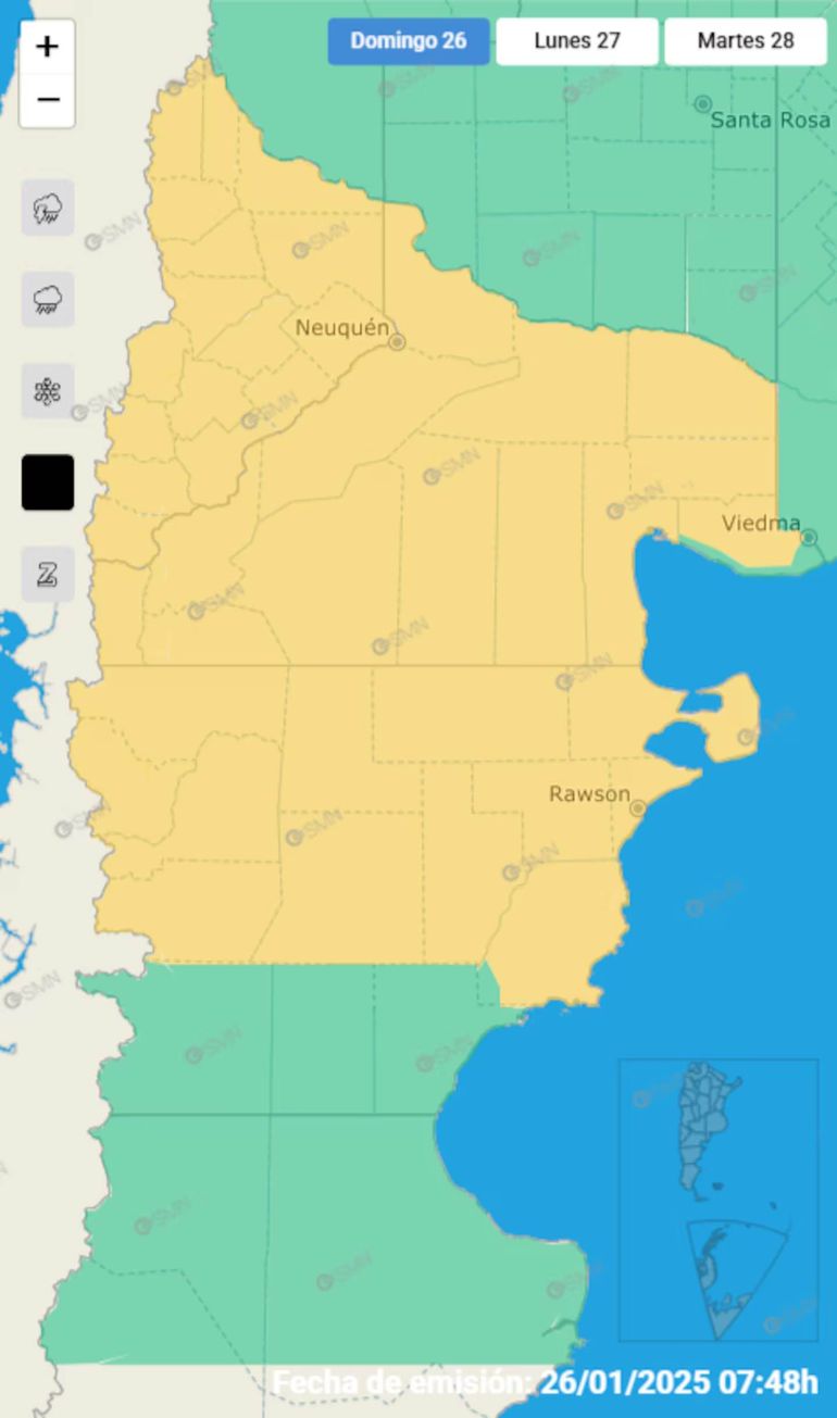 La alerta rige para Neuquén (por la tarde), Río Negro (por la noche) y en el centro y norte de Chubut (durante la tarde y la noche).