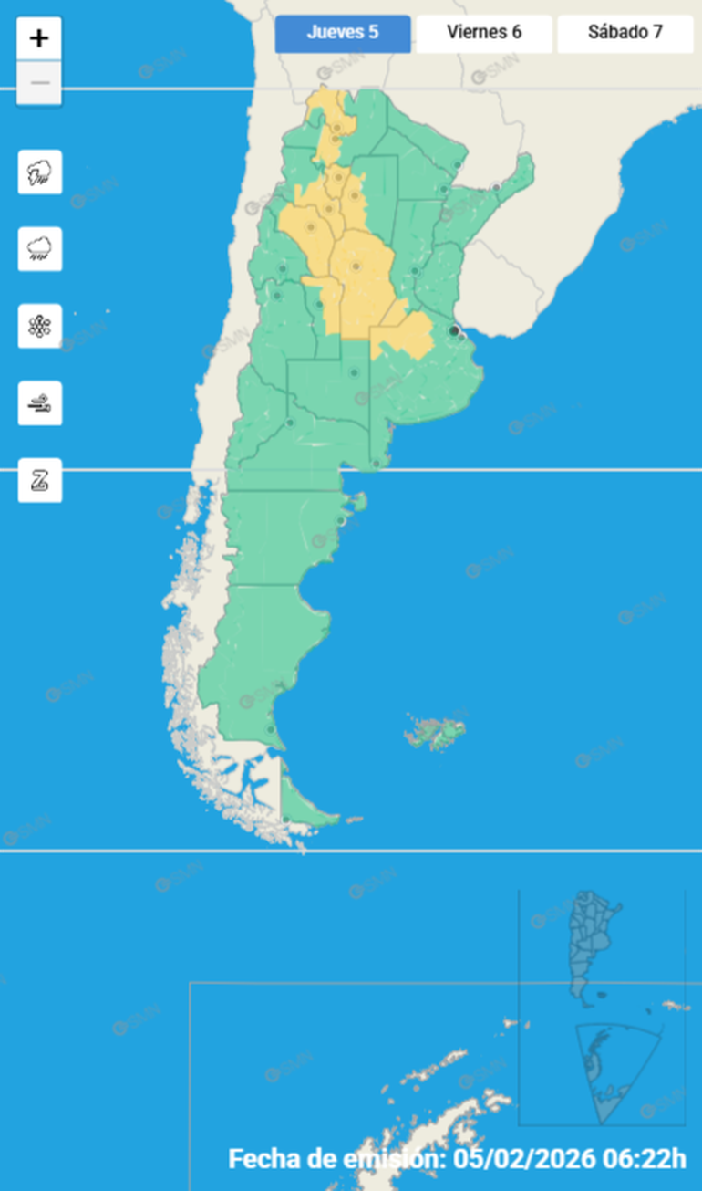 Asimismo, confirmó que esta alerta alcanzará a algunas zonas de Jujuy, Salta, Tucumán, Santiago del Estero, Catamarca, La Rioja, Córdoba, San Luis, Santa Fe y Buenos Aires para este jueves 5 de febrero.