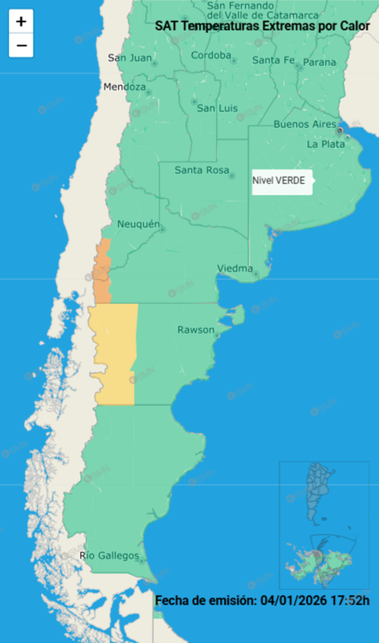 De acuerdo con las imágenes satelitales, el Servicio Meteorológico Nacional (SMN) mantiene vigentes advertencias por temperaturas extremas por calor en sectores de Neuquén, Río Negro y Mendoza, donde se identifican áreas en nivel de alerta amarillo y naranja.