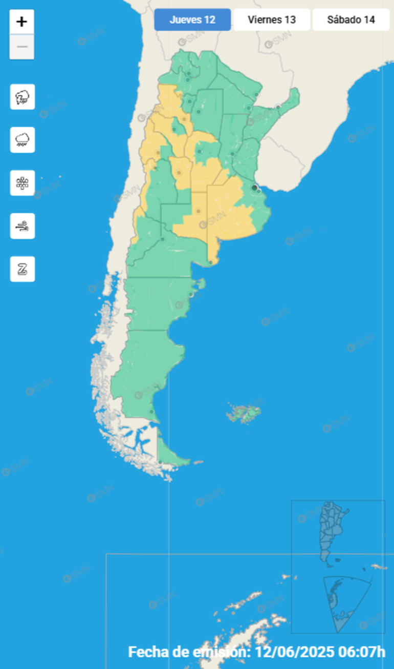En las últimas horas, el Servicio Meteorológico Nacional (SMN) emitió varias alertas amarillas que afectarán durante este jueves a más de la mitad del país. Según se precisó, se extenderán en un total de 13 provincias.