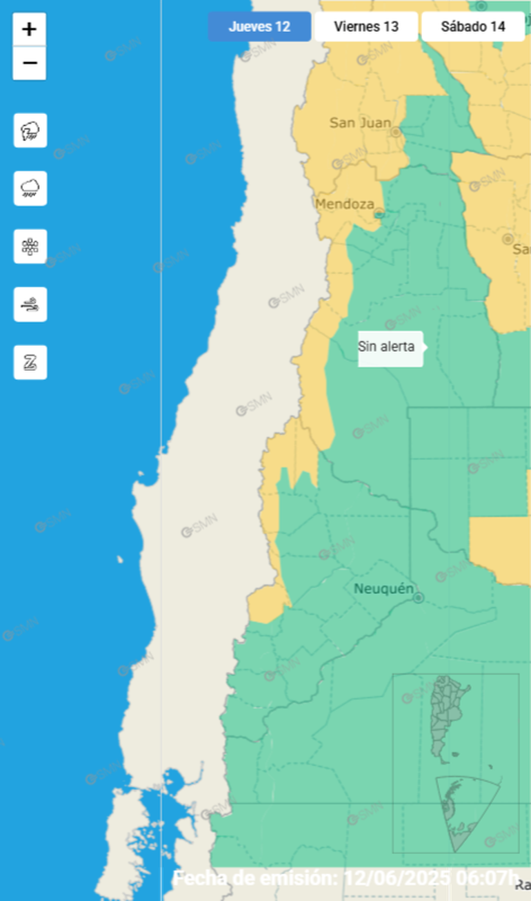 Puntualmente, desde el organismo nacional, indicaron que estarán comprendidos por la alerta: la cordillera de Aluminé, cordillera de Chos Malal, cordillera de Loncopué, cordillera de Minas, cordillera de Picunches y la cordillera de Ñorquín.