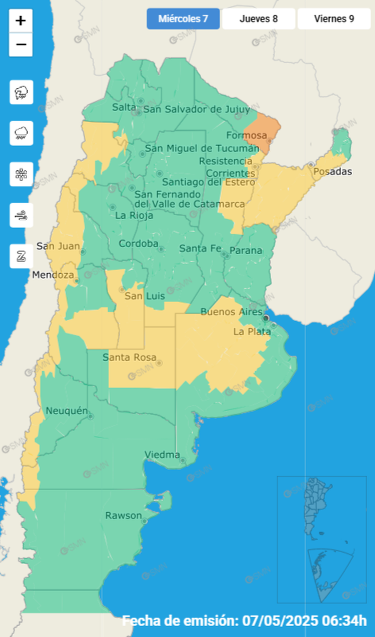 La alerta por tormentas afectará la ciudad y provincia de Buenos Aires, Chaco, Corrientes, Mendoza, La Pampa, Misiones, San Luis y Santa Fe. Por su parte, Formosa tiene el aviso tiene mayor intensidad, con un nivel naranja.