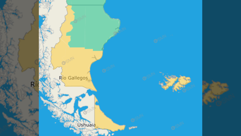 Por otro lado, en Santa Cruz, Tierra del Fuego y la Islas Malvinas, rige una alerta amarillo por vientos fuertes, que alcanzarán a las provincias de Santa Cruz y Tierra del Fuego.