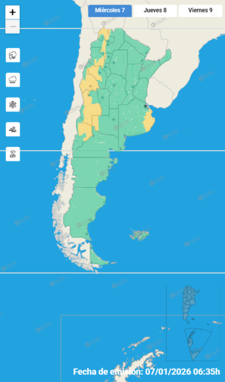 El Servicio Meteorológico Nacional (SMN) emitió una seria de alertas de nivel amarillo y naranja que tendrán vigencia durante toda la jornada de este miércoles 7 de enero.