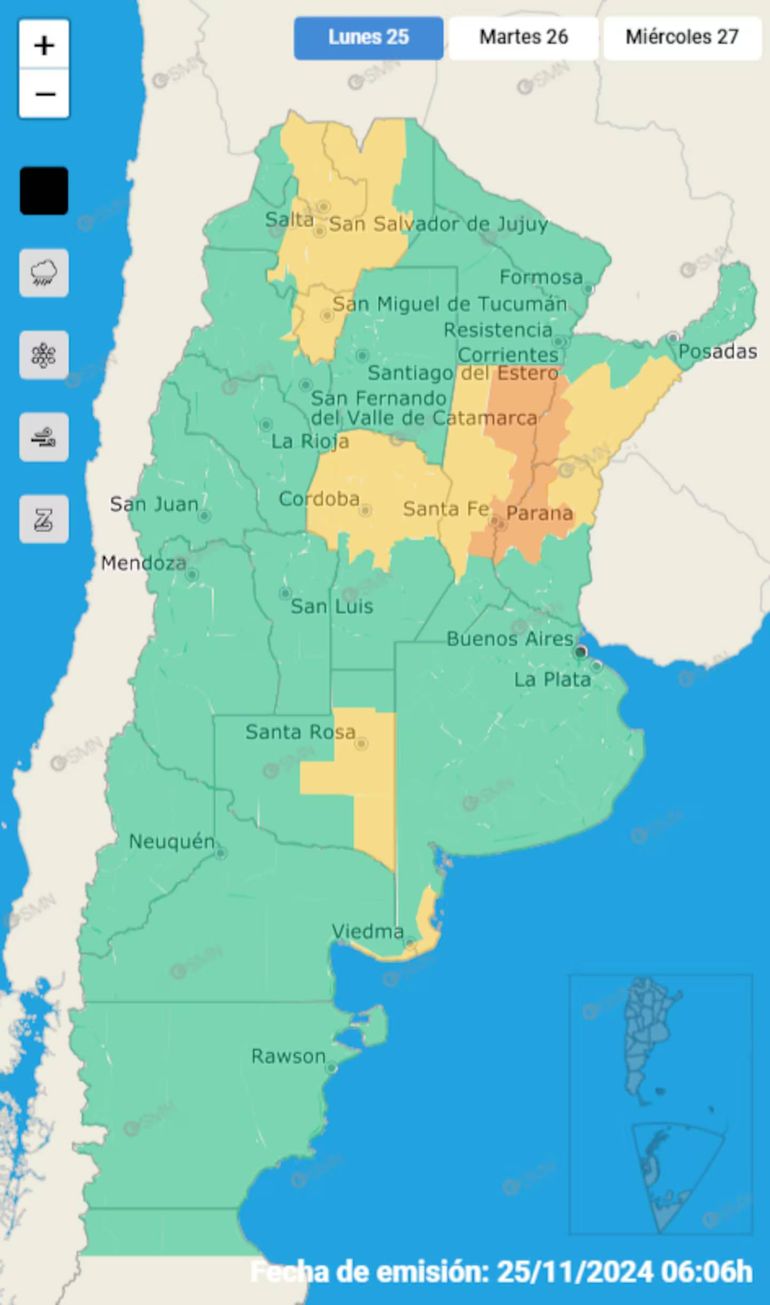 El Servicio Meteorológico Nacional (SMN) emitió una alerta de nivel naranja por tormentas, con un pico del fenómeno que se espera para el martes y la tarde de este lunes en varias provincias argentinas.