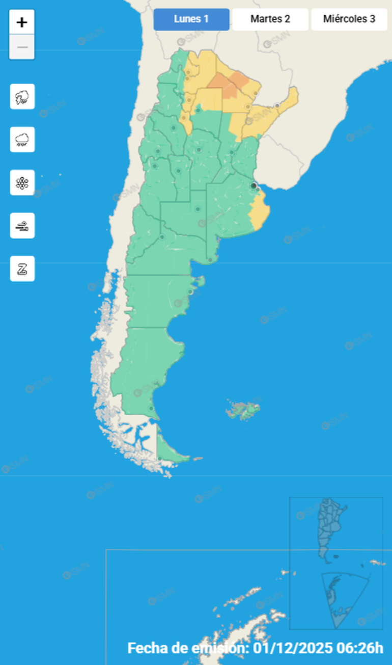 Esta alerta rige en Corrientes, el sur de Misiones, Santa Fe, Chaco, Formosa, Córdoba, el sur de Santiago del Estero, el noreste de Salta, el este de Jujuy y el oeste de Catamarca.
