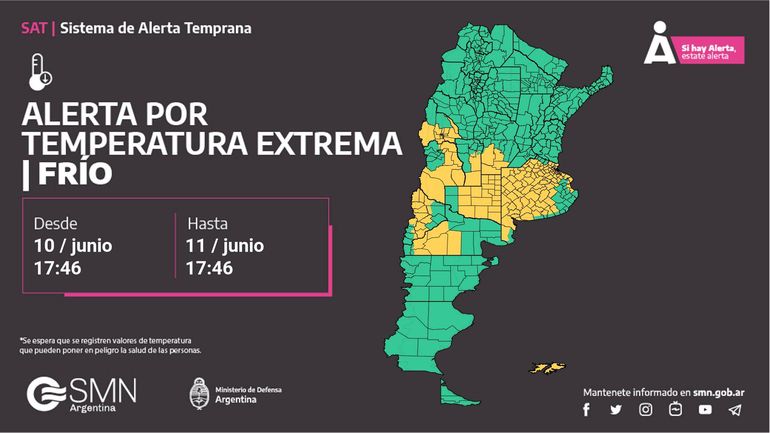 El Servicio Nacional Meteorológico (SMN) activó una alerta amarilla debido a la llegada de una intensa ola polar que afectará a diversas regiones de Argentina. La alerta abarca la Ciudad Autónoma de Buenos Aires (CABA), la provincia de Buenos Aires, Córdoba, La Pampa, San Luis, San Juan, Mendoza, Neuquén y Río Negro. Esta advertencia entró en vigor durante la tarde del sábado y se extenderá hasta las 18 horas del domingo.