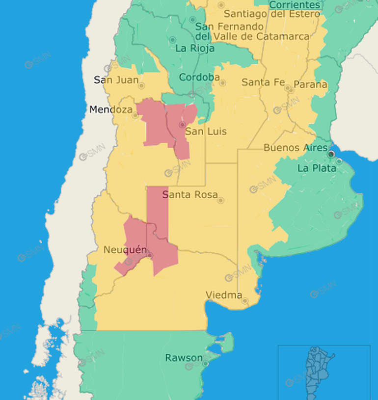 El Servicio Meteorológico Nacional (SMN) emitió un alerta de nivel rojo para varias provincias debido a una ola de calor intensa y "muy peligrosa" para la salud. Este fenómeno afecta sectores de San Luis, Mendoza, La Pampa, Río Negro y Neuquén, donde se registrarán temperaturas cercanas a los 39 grados.